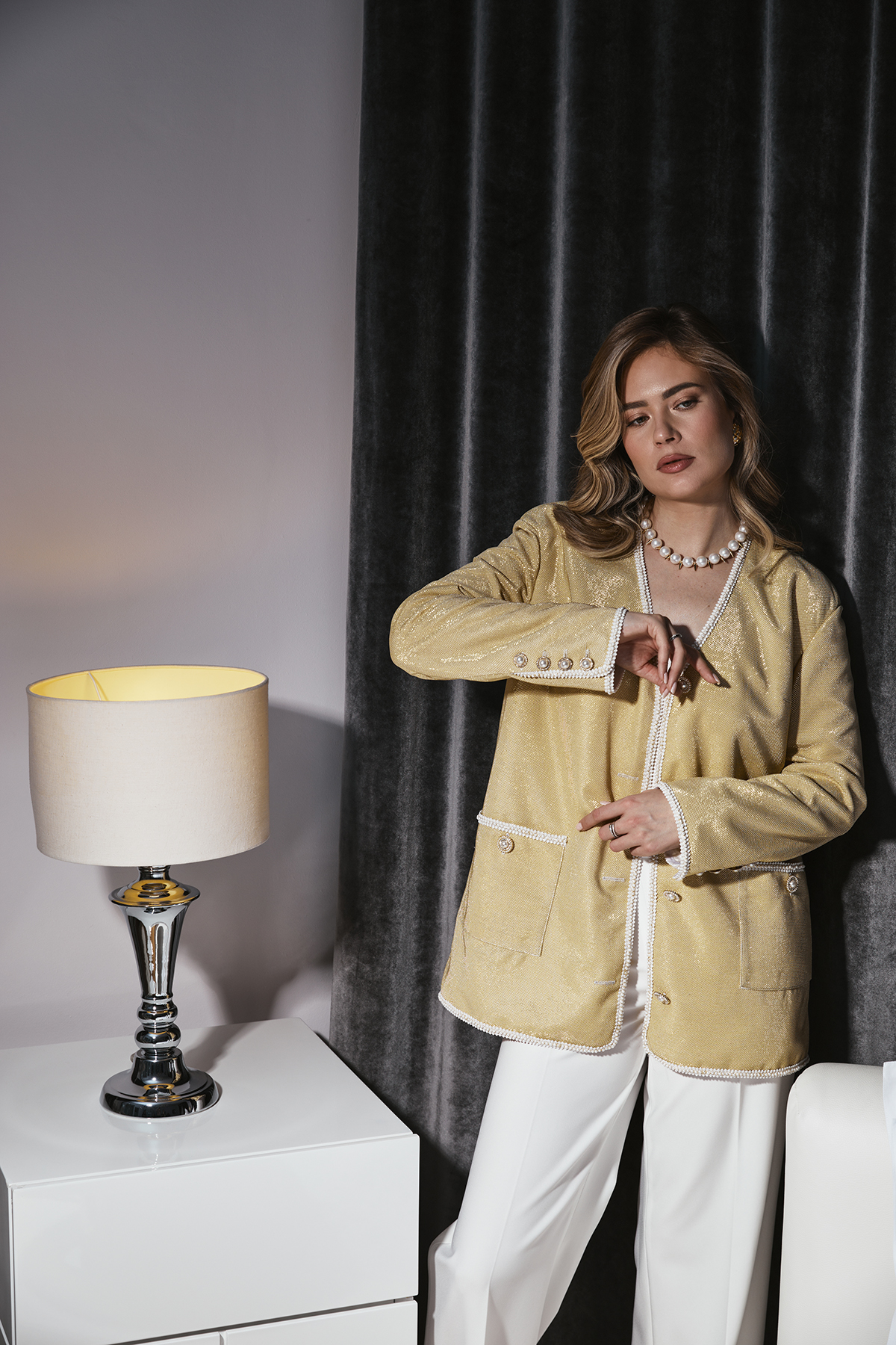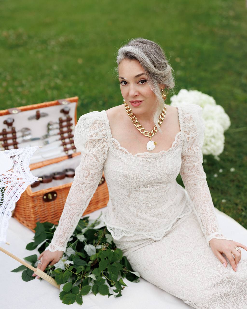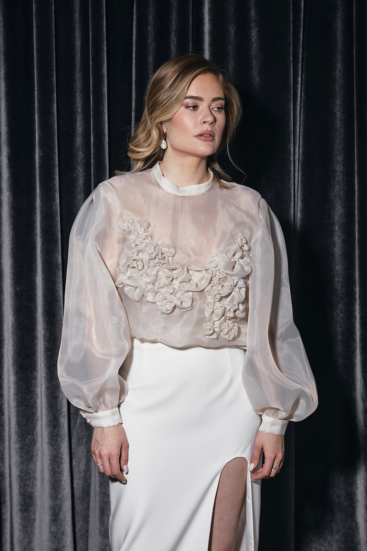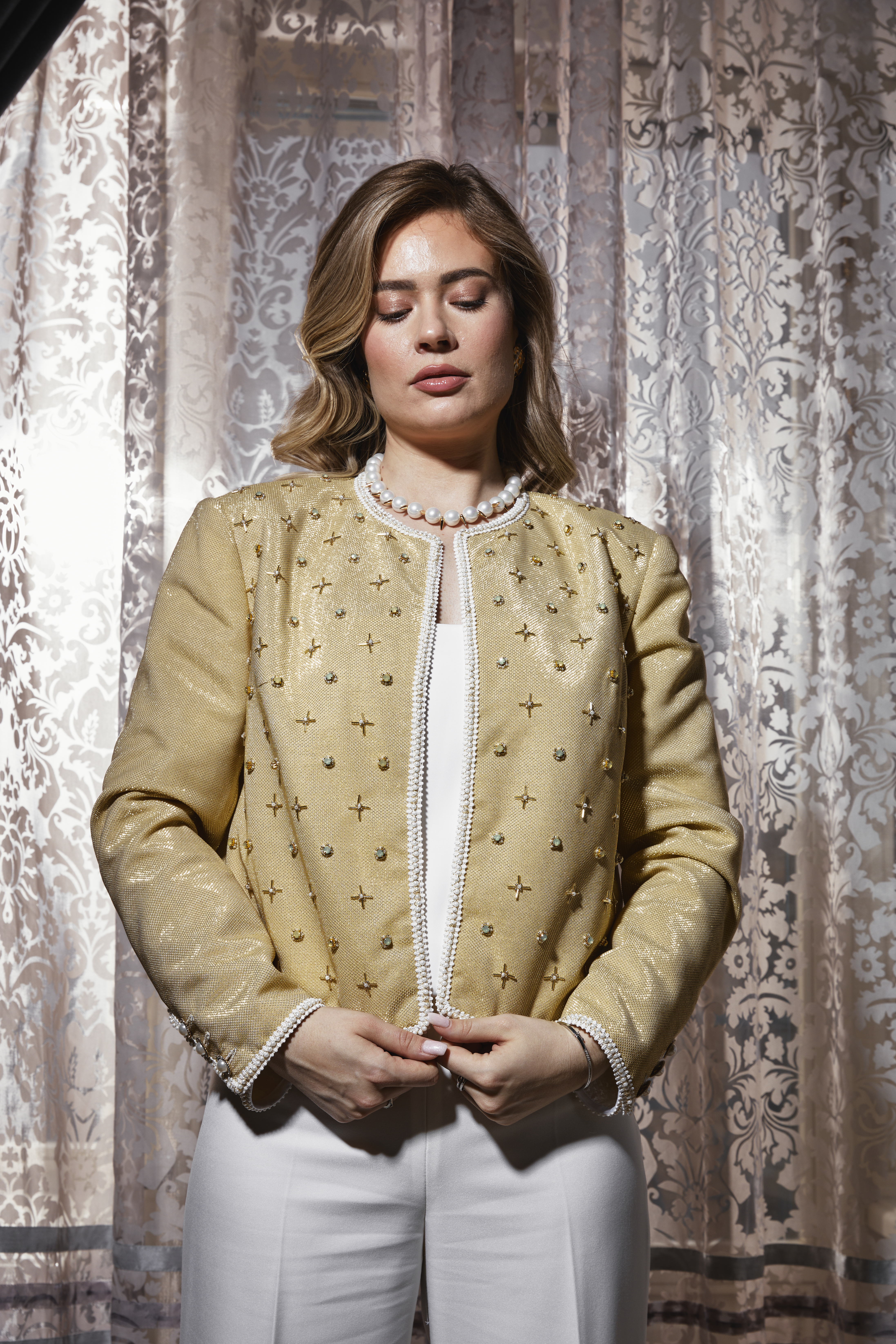 Каждая ниточка, каждая пуговка коллекции «Пробуждение» пронизана предвкушением весны, тепла, расцветающей из-под снега жизни. Силуэты моделей навеяны изящным образом пробуждающейся девушки-весны, дарящей первые цветы. Мне первый раз не хотелось использовать никакие яркие или насыщенные цвета. И я вдохновилась белым цветом. У меня тут же появилось ощущение чистоты, свежести, свободы, воздуха, неограниченных возможностей и света. К белому я добавила золото и серебро. И женственность стала роскошной, изысканность царской, а статность стала изящной. И коллекция приобрела неповторимость, интересные детали, сложные вышивки и десятки часов кропотливого ручного труда